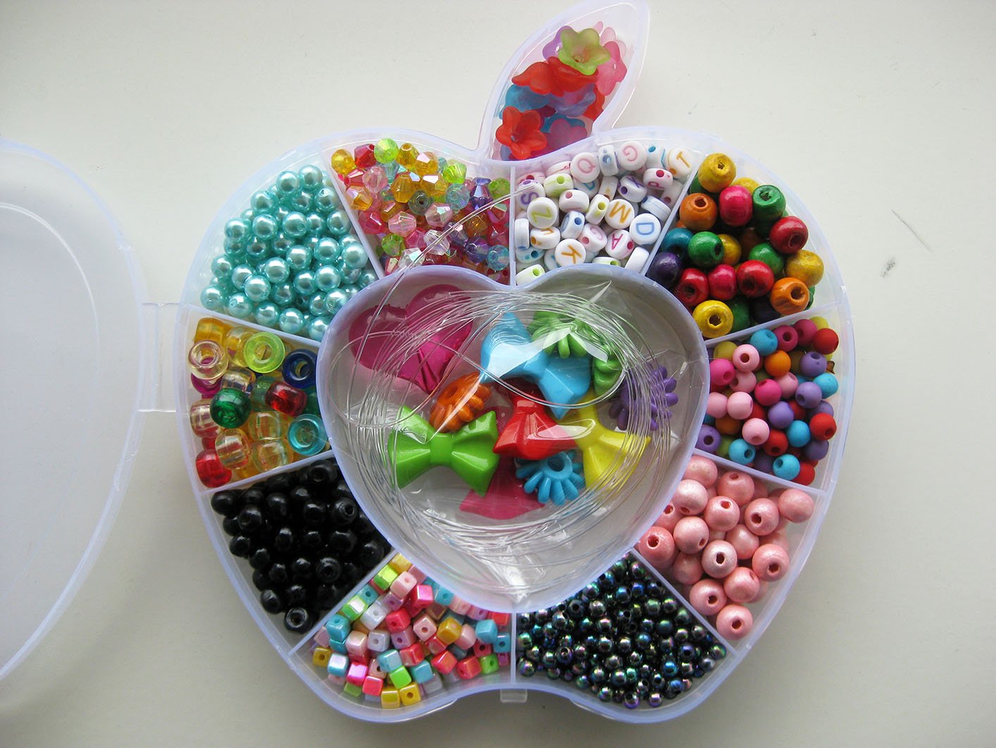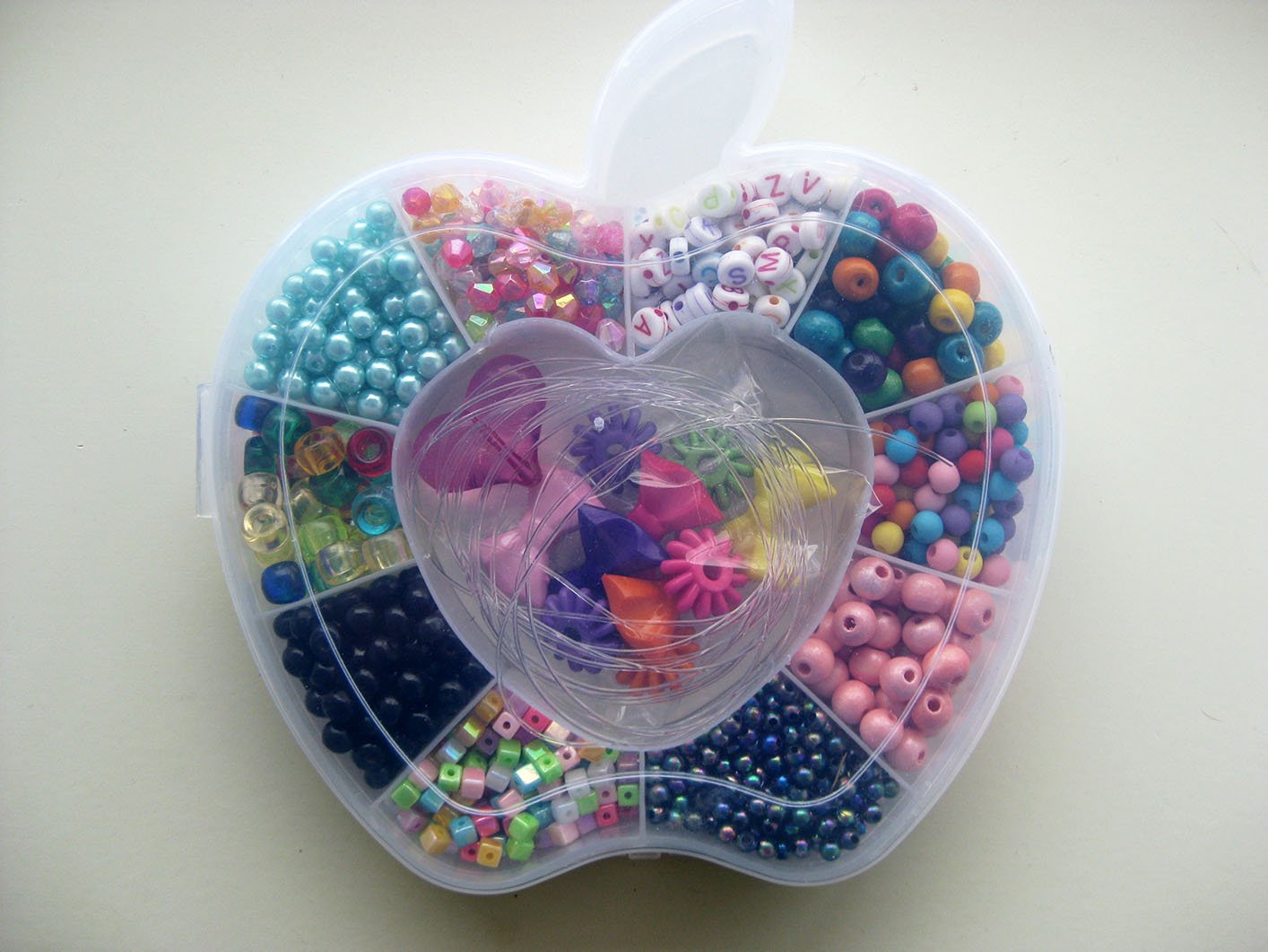Söt äppleask med 12 olika fack fyllda med pärlor och tillbehör.