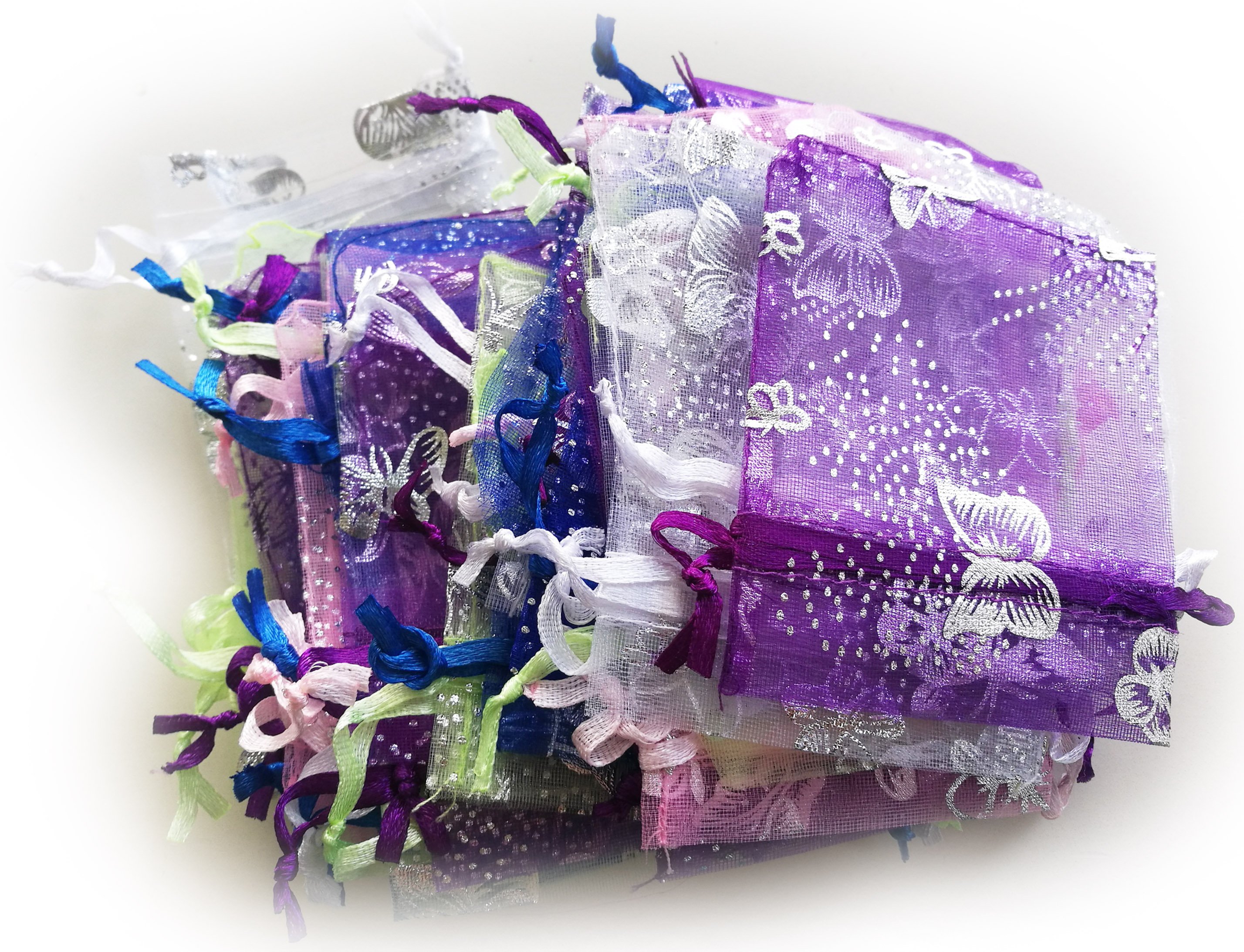 Vackra organzapåsar i olika färger med silvertryck, 30 stycken i storleken 7×9 cm.